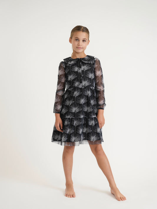 שמלת רשת Tween בשחור ולבן (שרוולים מרופדים, מעבר לגרסת הברך)