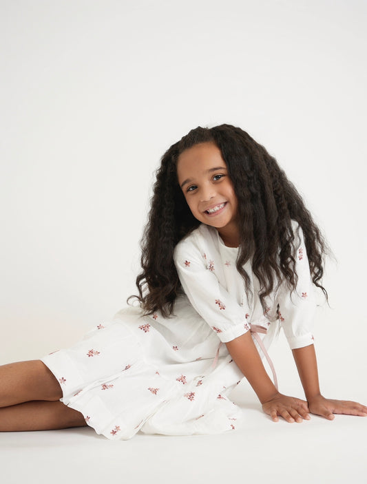 שמלת שרוך רקומה בצבע לבן וורוד פרחוני (מעבר לגרסה באורך הברך)